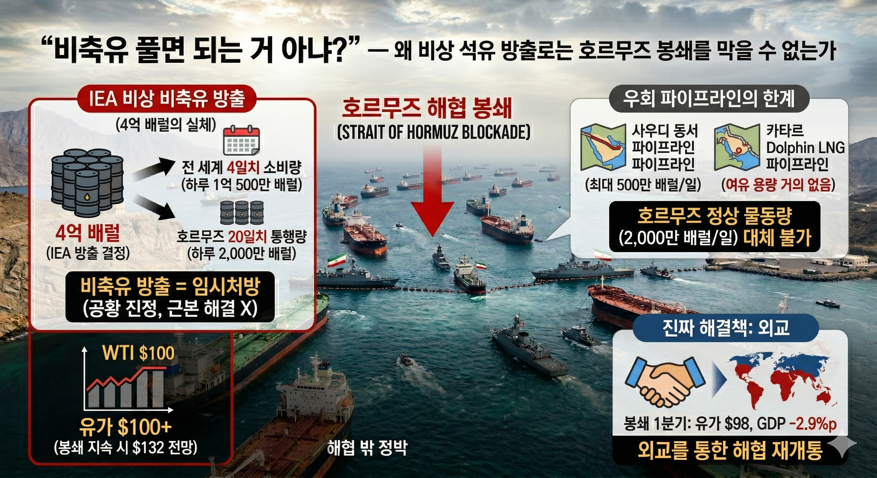 결국 비축유 방출은 임시처방일 뿐, 진짜 해결책은 외교를 통한 해협 재개통입니다.