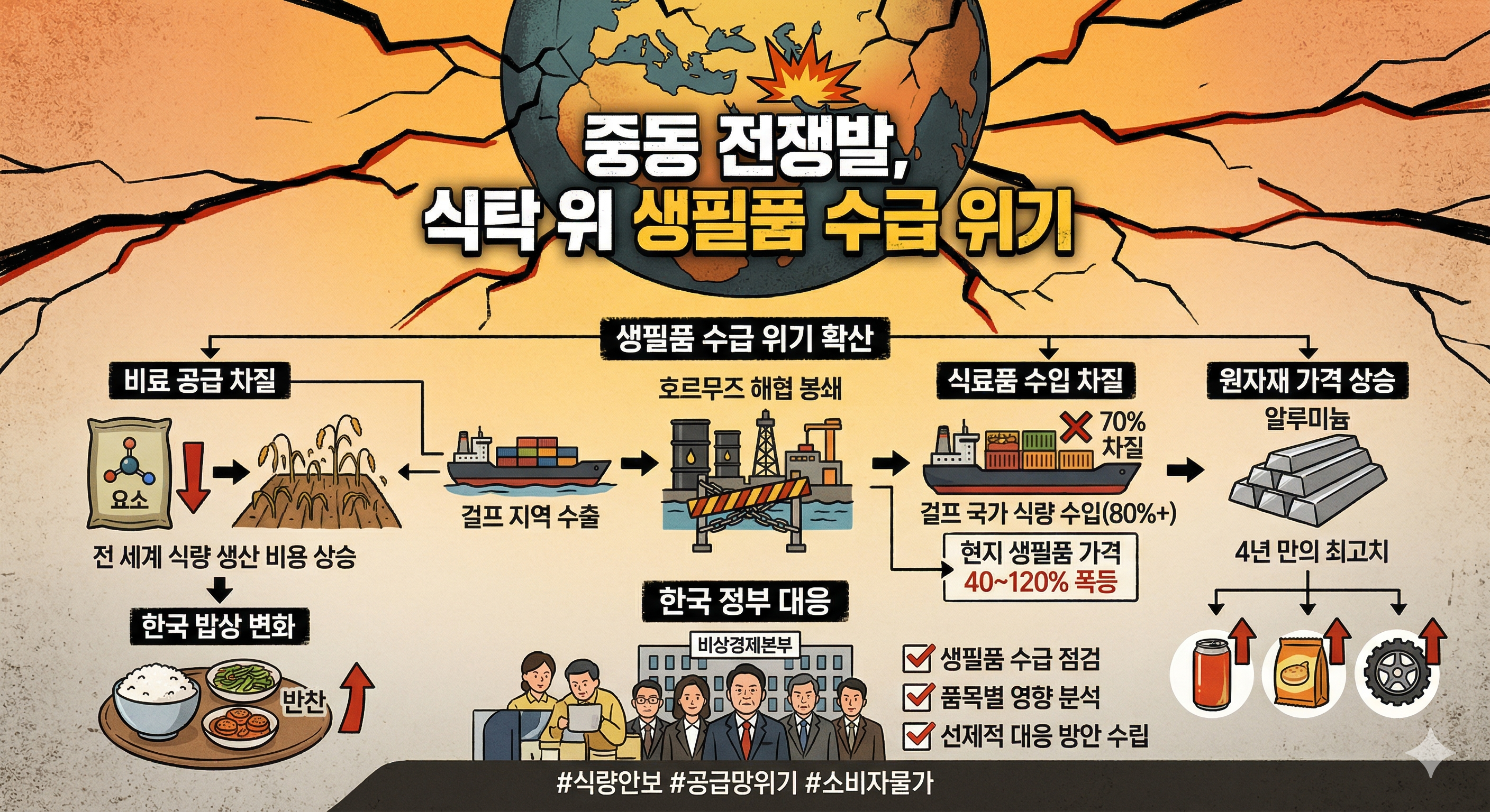 지금 중동 전쟁은 에너지 위기이면서 동시에 식량·원자재 위기입니다. 가정에서 에너지를 아끼고, 생필품 사재기보다 정상적 소비를 유지하는 것이 개인 차원에서 할 수 있는 가장 현명한 대응입니다.