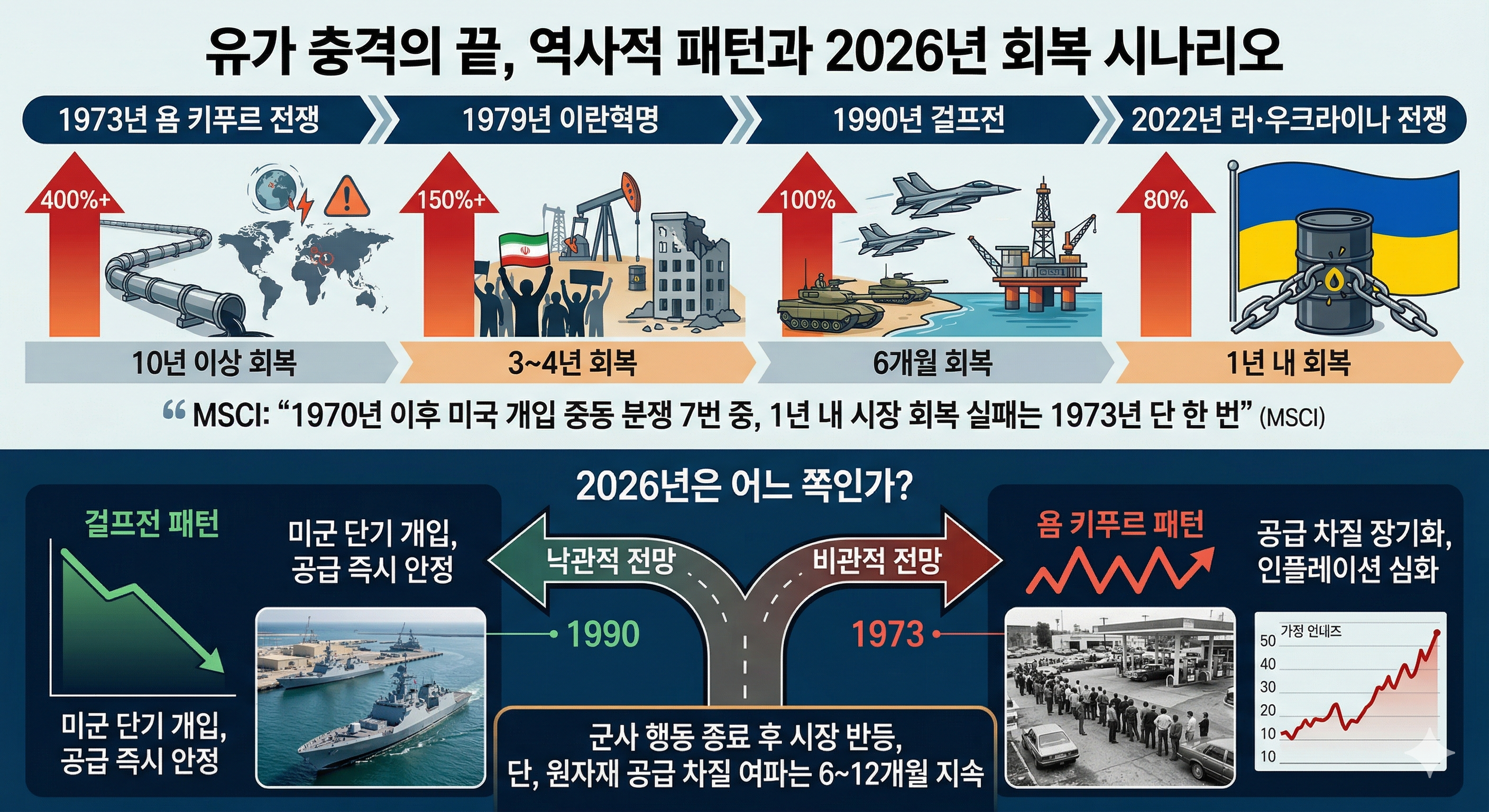 낙관적으로 보면 1990년 걸프전과 유사합니다. 미국의 군사 개입으로 단기간에 정리되고 유가가 빠르게 안정됐습니다. 비관적으로 보면 1973년과 유사합니다. 에너지 공급 차질이 단기에 해소되지 않고 인플레이션이 장기화됩니다.