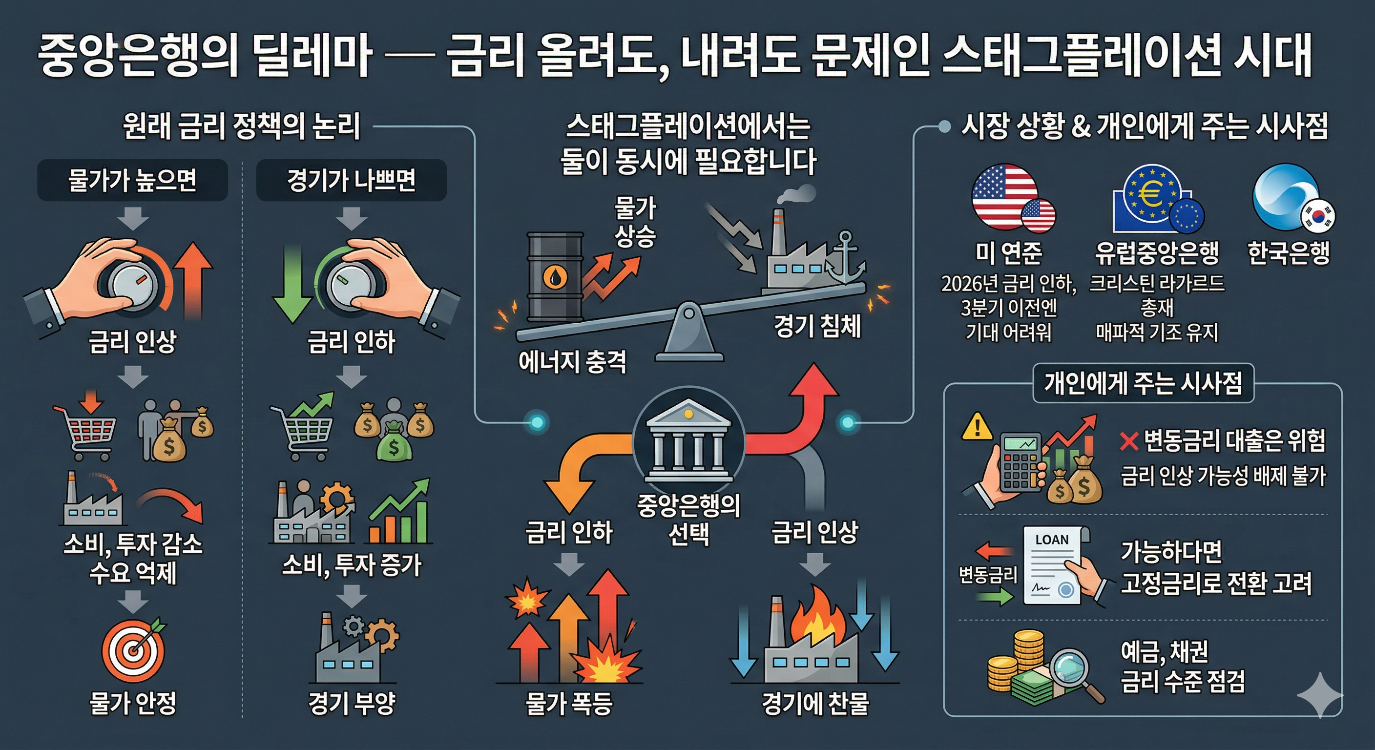 미국 연준(Fed)도, 유럽중앙은행(ECB)도, 한국은행도 지금 같은 딜레마에 빠져 있습니다. 금리 하나로 물가와 경기 두 마리 토끼를 잡는 게 왜 어려운지 설명해 드립니다.